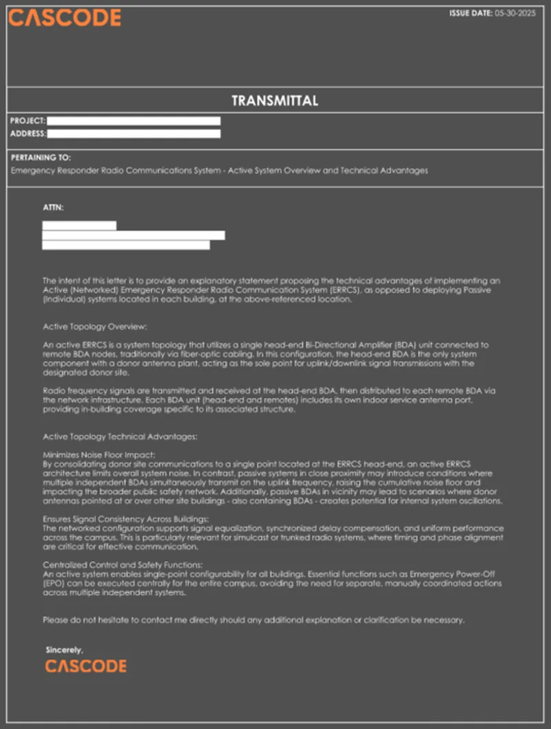 CASCODE works in parallel with project stakeholders to verify requirements, validate designs, and support the successful integration of life safety communications and control systems.